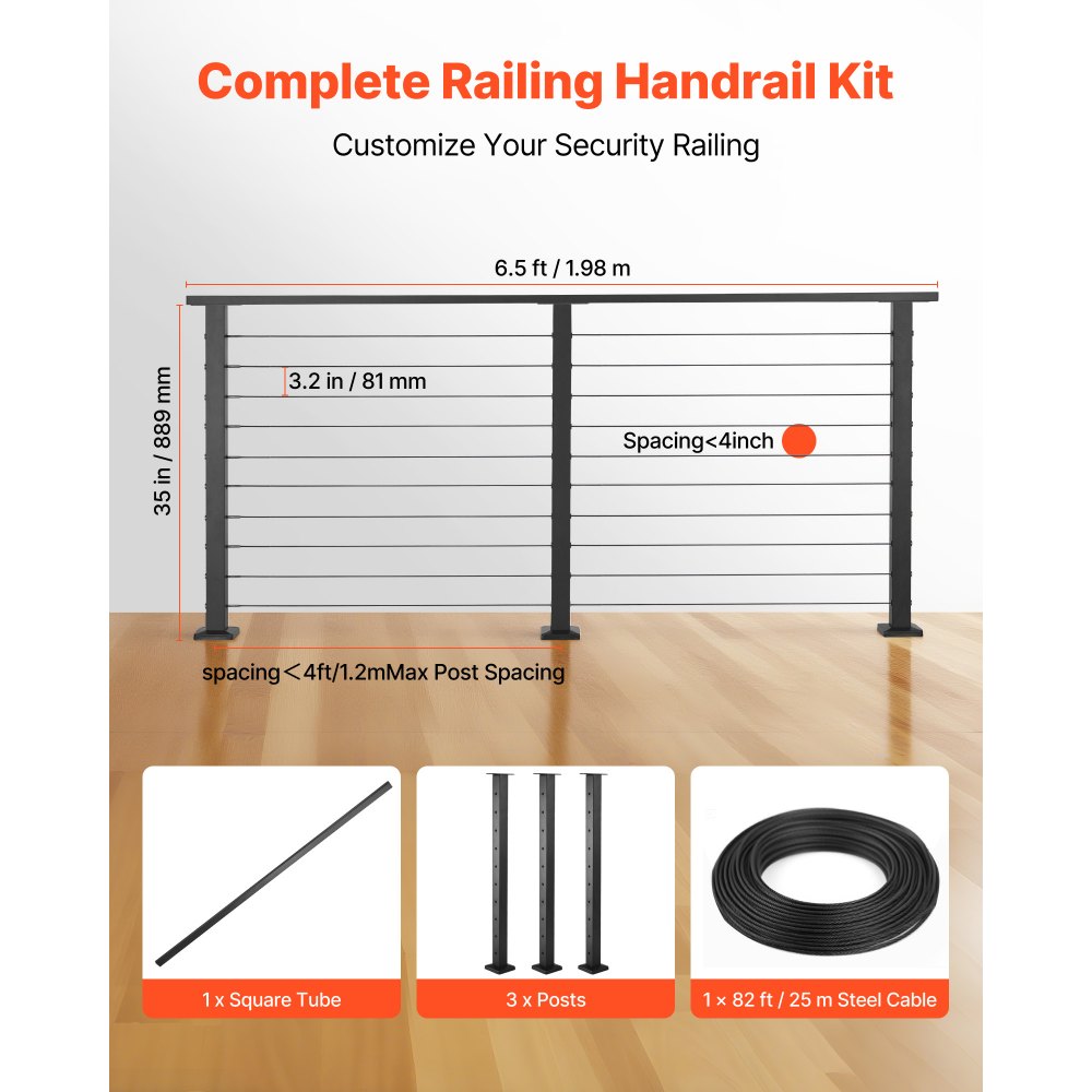 Μήκος: 6,5 πόδιαΠοσότητα: 1 τετράγωνος σωλήνας, 3 στύλοι, καλώδιο 25 μέτρωνΧρώμα: Ματ ΜαύροΚύριο υλικό: 304 ανοξείδωτο ατσάλιΔιαστάσεις αντικειμένου: 78 x 4,3 x 36,1 ίντσες / 1981 x 110 x 918 χιλιοστά