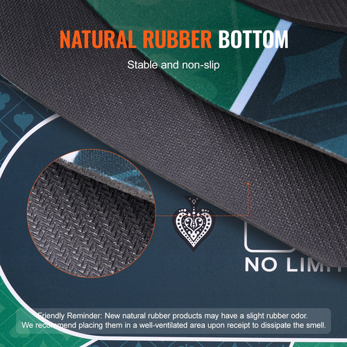Εξαιρετική δεξιοτεχνία και υψηλή αντοχή: Το πατάκι του τραπεζιού πόκερ είναι κατασκευασμένο από φυσικό καουτσούκ υψηλής πυκνότητας και ύφασμα υψηλής ποιότητας, με πάχος 0,12" / 3 mm, εξασφαλίζοντας εξαιρετική αντοχή και αποτρέποντας τις ρυτίδες όταν απλώνεται για παιχνίδια με χαρτιά. Είτε παίζετε στο σπίτι είτε στο μια αίθουσα πόκερ, κρατά σταθερά την επιφάνεια του τραπεζιού, διατηρώντας τη σταθερότητα για μια άνετη εμπειρία παιχνιδιού.