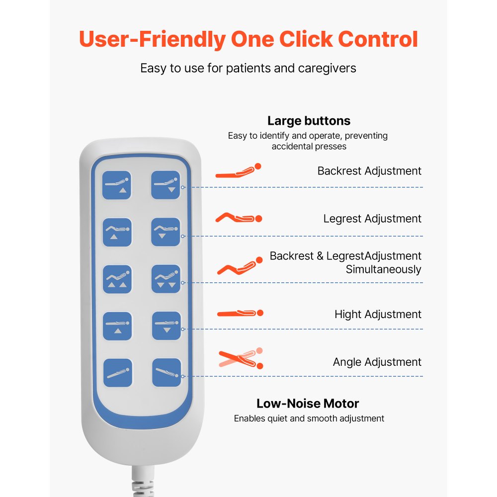 Ηλεκτρική ρύθμιση 5 λειτουργιών: Το πλήρως ηλεκτρικό νοσοκομειακό κρεβάτι μας υποστηρίζει ρύθμιση πλάτης 0–75°, ρύθμιση ποδιών 0–45°, ρυθμιζόμενο ύψος από 450 mm έως 750 mm, καθώς και ρύθμιση Trendelenburg και αντίστροφη ρύθμιση Trendelenburg για πιο ευέλικτη και άνετη φροντίδα. Ανώτερο Μηχανοκίνητο Σύστημα: Το πλήρως ηλεκτρικό νοσοκομειακό κρεβάτι 5 λειτουργιών μας χρησιμοποιεί έναν υψηλής ποιότητας ενεργοποιητή κινητήρα και σύστημα ελέγχου για ομαλές και αθόρυβες ρυθμίσεις. Με το χειριστήριο χειρός, οι ασθενείς ή οι φροντιστές μπορούν εύκολα να προσαρμόσουν τις θέσεις με ένα κουμπί. Στρώμα υψηλής ποιότητας: Διαθέτει στρώμα αφρού υψηλής πυκνότητας 30D 10cm που κατανέμει ομοιόμορφα την πίεση του σώματος για να μειώσει την ενόχληση από μεγάλες περιόδους ξαπλώματος, παρέχοντας εξαιρετική στήριξη και άνεση που προσαρμόζεται στο σώμα (ύψος κιγκλιδώματος προς στρώμα: 230mm) Εύκολη κινητικότητα και ασφαλές κλείδωμα: Εξοπλισμένο με τέσσερις περιστρεφόμενους τροχούς 5 ιντσών με κλείδωμα, αυτό το ιατρικό κρεβάτι κινείται ομαλά σε διαφορετικές επιφάνειες δαπέδου. Και τα φρένα ασφάλισης διατηρούν το κρεβάτι σταθερά στη θέση του κατά τη διάρκεια της ανάπαυσης ή της φροντίδας για βελτιωμένη σταθερότητα. Σταθερό & Ισχυρό Πλαίσιο: Κατασκευασμένο με ανθεκτικό πλαίσιο από ανθρακούχο χάλυβα, αυτό το πλήρως ηλεκτρικό νοσοκομειακό κρεβάτι υποστηρίζει έως και 250 κιλά. Προσαρμόζεται άψογα σε νοσοκομεία, κέντρα αποκατάστασης και περιβάλλοντα κατ' οίκον φροντίδας, παρέχοντας αξιόπιστη υποστήριξη για καθημερινή χρήση φροντίδας.