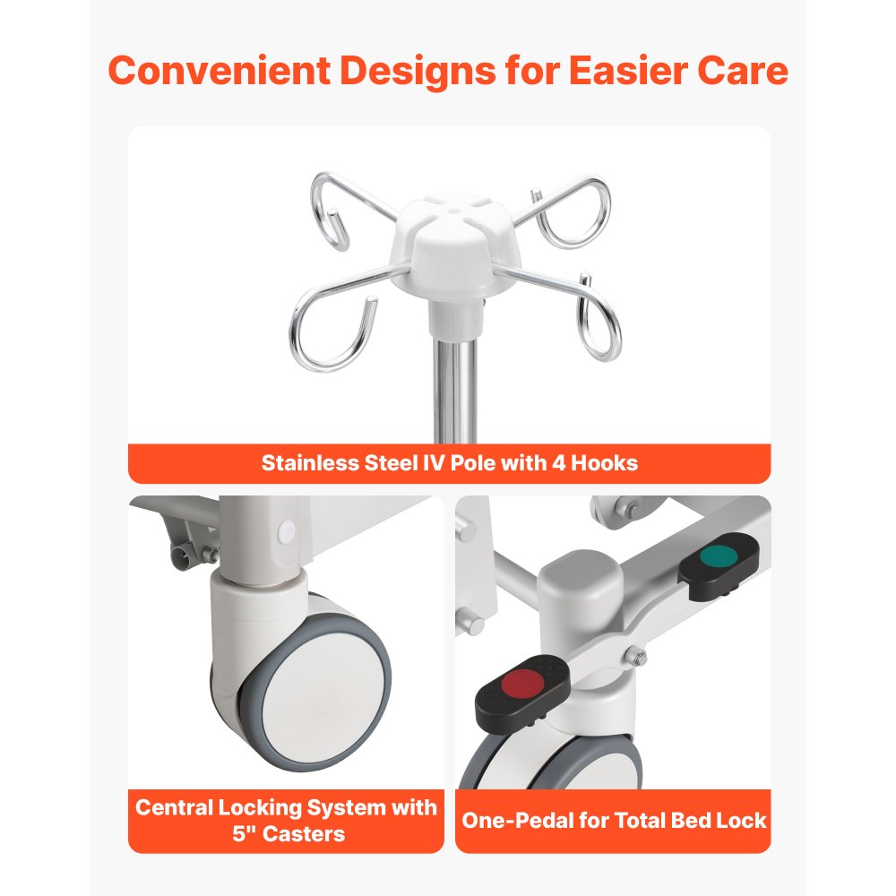 5 Λειτουργίες & Καρδιακή Καρέκλα: Αυτή η πλήρως ηλεκτρική νοσοκομειακή κλίνη υποστηρίζει τη θέση της καρδιακής καρέκλας, τη λειτουργία CPR, τη ρύθμιση πλάτης 0–75°, τη ρύθμιση ποδιών 0–45°, το ρυθμιζόμενο ύψος από 470mm έως 760mm, καθώς και την αντίστροφη τοποθέτηση Trendelenburg. Ανώτερο Μηχανοκίνητο Σύστημα: Το πλήρως ηλεκτρικό νοσοκομειακό κρεβάτι 5 λειτουργιών μας χρησιμοποιεί έναν υψηλής ποιότητας ενεργοποιητή κινητήρα και σύστημα ελέγχου για ομαλές και αθόρυβες ρυθμίσεις. Με το χειριστήριο χειρός ή τον πίνακα ελέγχου νοσηλευτή, οι ασθενείς ή οι φροντιστές μπορούν εύκολα να προσαρμόσουν τις θέσεις των κλινών. Ένα πεντάλ για πλήρες κλείδωμα κρεβατιού: Διαθέτει αναβαθμισμένο σύστημα κεντρικού κλειδώματος με τροχούς 5" και ενσωματωμένα πεντάλ φρένων. Πιέστε τον κόκκινο μοχλό προς τα κάτω για να ασφαλίσετε όλους τους τροχούς για σταθερή τοποθέτηση ή πιέστε τον πράσινο μοχλό προς τα κάτω για να ξεκλειδώσετε για ομαλή κίνηση. Στρώμα υψηλής ποιότητας: Διαθέτει στρώμα αφρού υψηλής πυκνότητας 15 cm που κατανέμει ομοιόμορφα την πίεση του σώματος για να μειώσει την ενόχληση από μεγάλες περιόδους ξαπλώματος, παρέχοντας εξαιρετική στήριξη και άνεση που προσαρμόζεται στο σώμα (ύψος κιγκλιδώματος προς στρώμα: 200 mm) Σταθερό & Ισχυρό Πλαίσιο: Κατασκευασμένο με ανθεκτικό πλαίσιο από ανθρακούχο χάλυβα, αυτό το ηλεκτρικό ιατρικό κρεβάτι υποστηρίζει έως και 250 κιλά. Προσαρμόζεται άψογα σε νοσοκομεία, κέντρα αποκατάστασης και περιβάλλοντα κατ' οίκον φροντίδας, παρέχοντας αξιόπιστη υποστήριξη για καθημερινή χρήση φροντίδας.