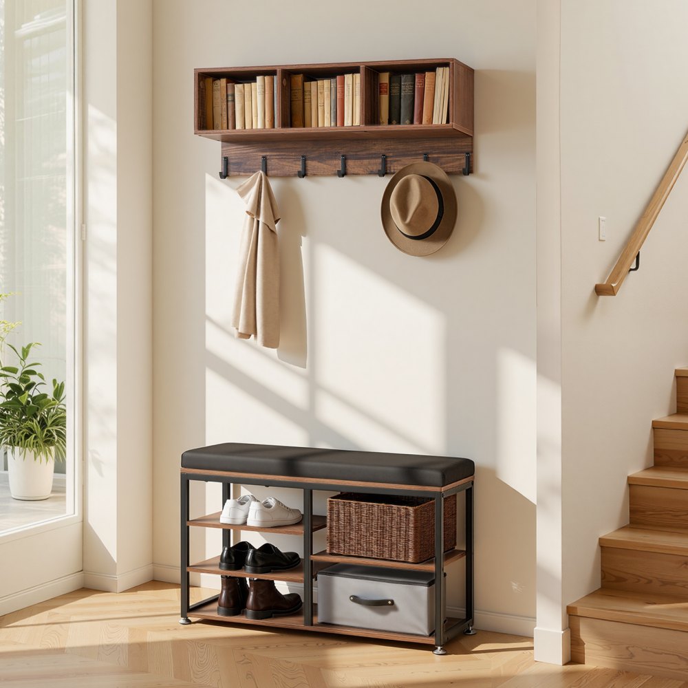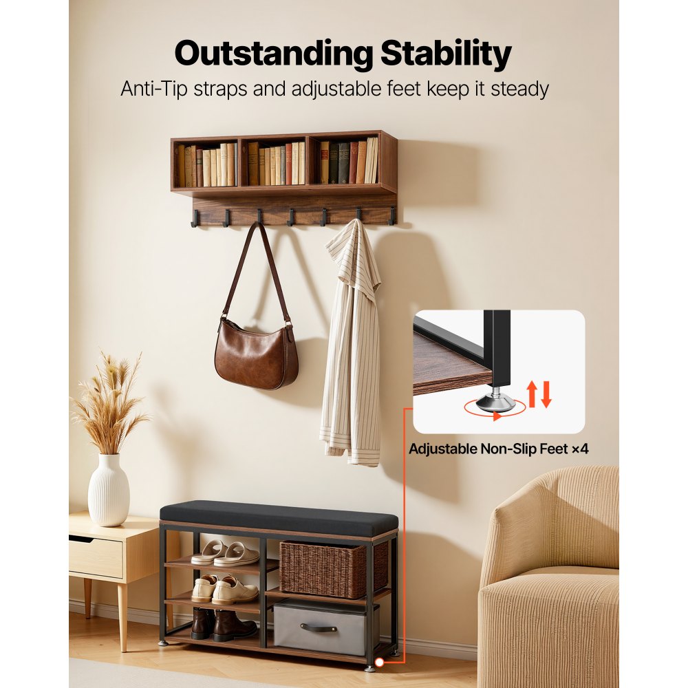 Πολυλειτουργικός σχεδιασμός: Αυτή η ανοιχτή κρεμάστρα ρούχων διαθέτει μια κλιμακωτή διάταξη αποθήκευσης που μεγιστοποιεί τον κατακόρυφο χώρο, βοηθώντας στην αποτελεσματική οργάνωση των ρούχων και των αξεσουάρ, ενώ παράλληλα απελευθερώνει πολύτιμο χώρο στο δάπεδο για να διατηρείτε το σπίτι σας τακτοποιημένο. Γάντζοι με ομοιόμορφη απόσταση: Με 7 γάντζους, αυτή η κρεμάστρα παπουτσιών και παλτών παρέχει αξιόπιστο χώρο για κρέμασμα καπέλων, μπουφάν, κασκόλ και άλλων, επιτρέποντας γρήγορη πρόσβαση και οργάνωση χωρίς ακαταστασία. Άνετη αλλαγή παπουτσιών: Η θήκη για παλτά με πάγκο για παπούτσια υποστηρίζει εύκολη αλλαγή παπουτσιών, ενώ 3 χαμηλές θήκες για παπούτσια και 2 ψηλές θήκες για παπούτσια διατηρούν τα αθλητικά παπούτσια, τα καθημερινά παπούτσια και τις μπότες τακτοποιημένα και εύκολα προσβάσιμα. Σταθερός και ασφαλής σχεδιασμός: Εξοπλισμένο με ιμάντες κατά της ανατροπής στο πάνω μέρος και ρυθμιζόμενα αντιολισθητικά πόδια στη βάση, το ράφι παπουτσιών και ρούχων μας παραμένει σταθερό κατά τη χρήση και βοηθά στη μείωση του κινδύνου ανατροπής. Ευέλικτη χρήση: Με μια καθαρή, μοντέρνα εμφάνιση και προσεγμένη κατασκευή, η θήκη παπουτσιών λειτουργεί τόσο ως πρακτική αποθήκευση όσο και ως διακοσμητική πινελιά για εισόδους, υπνοδωμάτια, χώρους καθιστικού ή διαδρόμους.