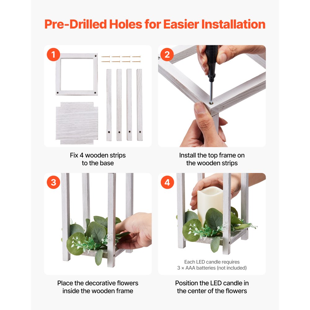 Αισθητικός Σχεδιασμός: Αυτό το ξύλινο φανάρι γάμου διαθέτει ένα τεχνητό στεφάνι ευκαλύπτου και κεριά LED για μια ζεστή, ρομαντική λάμψη. Κατασκευασμένο από ανθρακονημάτινο φινίρισμα με λευκή βαφή σε φθαρμένο χρώμα, είναι ιδανικό για γάμους, διαδρόμους και στρώσεις τραπεζιών. Ανθεκτικά Υλικά: Σε αντίθεση με τα εύθραυστα πλαστικά φανάρια, τα ξύλινα φανάρια μας υιοθετούν ένα πλαίσιο από ανθρακούχο κέδρο με φυσικά νερά και κυβική δομή με σταθερό σχήμα. Αντέχουν σε επαναλαμβανόμενες μετακινήσεις, τοποθετήσεις και μεταφορές για συχνές εκδηλώσεις ή εμπορική χρήση. Πλήρες σετ φαναριών: Το ξύλινο φανάρι διαθέτει 12 ξύλινα φανάρια (5,51 x 5,51 x 10,03 ίντσες), 12 κεριά LED (Ø2,95 x 4,45 ίντσες, απαιτούνται 3 μπαταρίες AAA—δεν περιλαμβάνονται) και 12 στεφάνια ευκαλύπτου (Ø9,84 ίντσες). Όλα σε ένα για γάμους, γιορτές ή διακόσμηση σπιτιού. Εύκολη και γρήγορη συναρμολόγηση: Αυτά τα ξύλινα φανάρια διαθέτουν αρκετές βίδες και ένα ειδικό κατσαβίδι. Με προ-τρυπημένες τρύπες και εικονογραφημένο εγχειρίδιο χρήσης, είναι εύκολα στην εγκατάσταση χωρίς να απαιτούνται επιπλέον εργαλεία, ακόμη και για αρχάριους. Εξοικονομήστε χρόνο στην προετοιμασία της διακόσμησης. Επαναχρησιμοποιήσιμο για πολλαπλά σενάρια: Το κεντρικό μας φανάρι είναι συμπαγές για τοποθέτηση σε τραπεζαρίες, γραφεία υποδοχής, βιβλιοθήκες, βάσεις τηλεόρασης και κομοδίνα. Ιδανικό για γάμους, οικογενειακά δείπνα ή φεστιβάλ όπως η Ημέρα του Αγίου Βαλεντίνου, τα Χριστούγεννα και η Ημέρα των Ευχαριστιών.