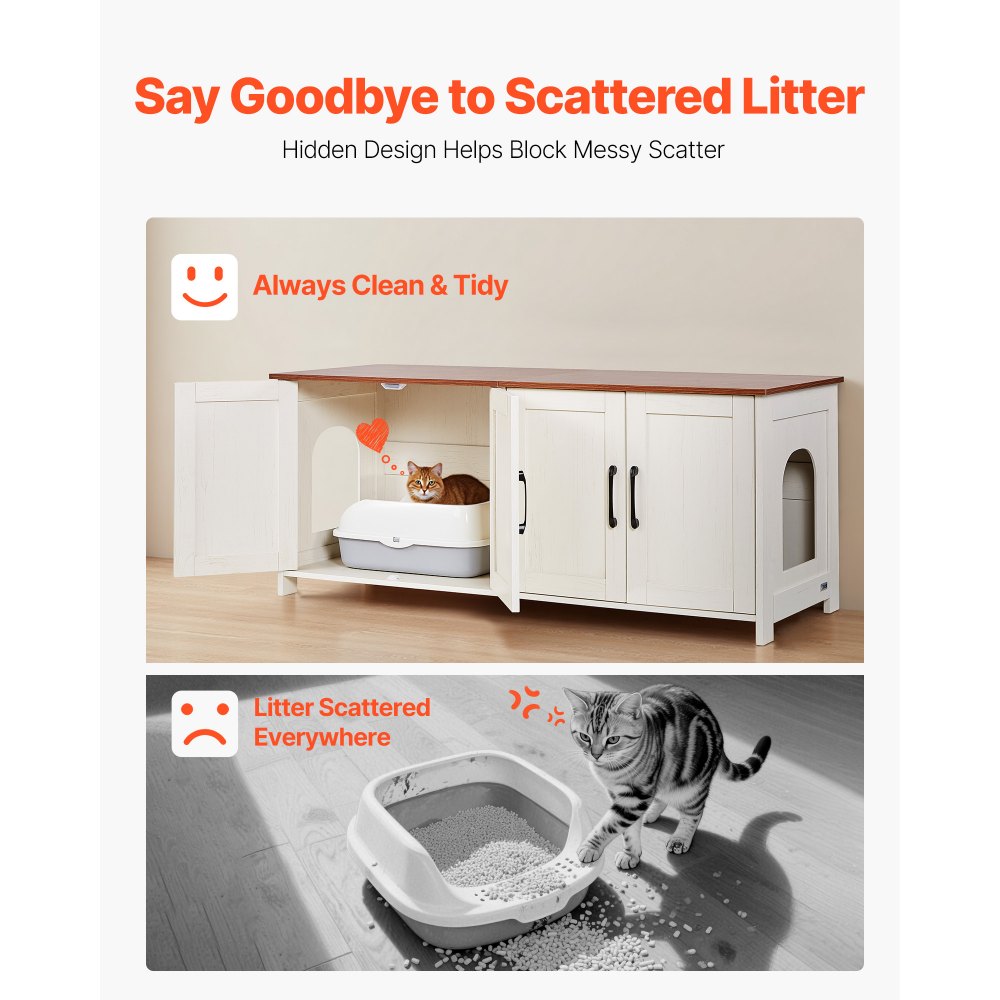 Ευρύχωρος σχεδιασμός πολλαπλής εισόδου: Με διαστάσεις 47,24 × 17,72 × 19,69 ίντσες, αυτός ο ξύλινος θάλαμος άμμου προσφέρει άφθονο χώρο με 4 πόρτες και 2 περάσματα για γάτες για εύκολη πρόσβαση. Ιδανικός για νοικοκυριά με πολλές γάτες, βοηθά στη μείωση των εδαφικών διαφορών και παρέχει μια πιο άνετη, προσαρμόσιμη εμπειρία αμμολεκάνης. Ανθεκτική και σταθερή δομή: Κατασκευασμένο από μοριοσανίδα 12 mm και MDF 15 mm για επιπλέον πάχος, αυτό το έπιπλο άμμου άμμου υποστηρίζει έως και 132,28 λίβρες στην κορυφή και 99,20 λίβρες στη βάση. Το φινίρισμα μελαμίνης είναι ανθεκτικό στο νερό και τις γρατσουνιές για ευκολότερο καθημερινό καθάρισμα. Ανθεκτική σε ζημιές κατασκευή: Αυτό το κρυφό περίβλημα για αμμοδόχο διαθέτει σχεδιασμό με τμηματικά πάνελ για ασφαλέστερη μεταφορά, μειώνοντας τον κίνδυνο θραύσης της σανίδας. Αυτός ο σχεδιασμός ελαχιστοποιεί τις γρατσουνιές, τα βαθουλώματα και τις ρωγμές, βελτιώνοντας την εμπειρία αποσυσκευασίας και μειώνοντας τις επιστροφές. Έλεγχος οσμών σε κλειστό χώρο: Το κλείσιμο με διπλή πόρτα και ανεξάρτητα πλευρικά παράθυρα εξαερισμού διατηρεί την άμμο της άμμου περιορισμένη και τις οσμές μειωμένες, προσφέροντας παράλληλα στις γάτες έναν ιδιωτικό χώρο χωρίς άγχος. Το ντουλάπι της άμμου διαθέτει πάνελ πόρτας σε στυλ μπαστούνι που εξασφαλίζουν ροή αέρα χωρίς να παγιδεύουν μυρωδιές μούχλας. Κομψή και πολυλειτουργική: Η θήκη άμμου άμμου για γάτες μας με κλασικό καφέ ξύλινο πάνω μέρος, λευκές πόρτες και μαύρες μεταλλικές λαβές ενσωματώνεται εύκολα σε διάφορους εσωτερικούς χώρους. Η στιβαρή πάνω πλευρά μπορεί να χρησιμεύσει ως κρεβάτι γάτας, ντουλάπι αποθήκευσης ή βοηθητικό τραπεζάκι, εξοικονομώντας χώρο και παράλληλα με την υπέροχη εμφάνιση.