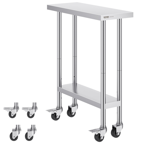 Ανοξείδωτο ατσάλι υψηλής ποιότητας: Αυτό το τραπέζι εργασίας, διαστάσεων 30 x 12 x 38 ιντσών, είναι κατασκευασμένο από ανοξείδωτο χάλυβα SUS201 για την επιφάνεια εργασίας, τα ράφια και τα πόδια. Προσφέρει εξαιρετική αντοχή στη σκουριά, κομψή εμφάνιση και λεία επιφάνεια που καθαρίζεται εύκολα με ένα απλό σκούπισμα. Με πιστοποίηση NSF, πληροί αυστηρά πρότυπα δημόσιας υγείας, εξασφαλίζοντας μακροχρόνια προστασία για την υγεία σας.