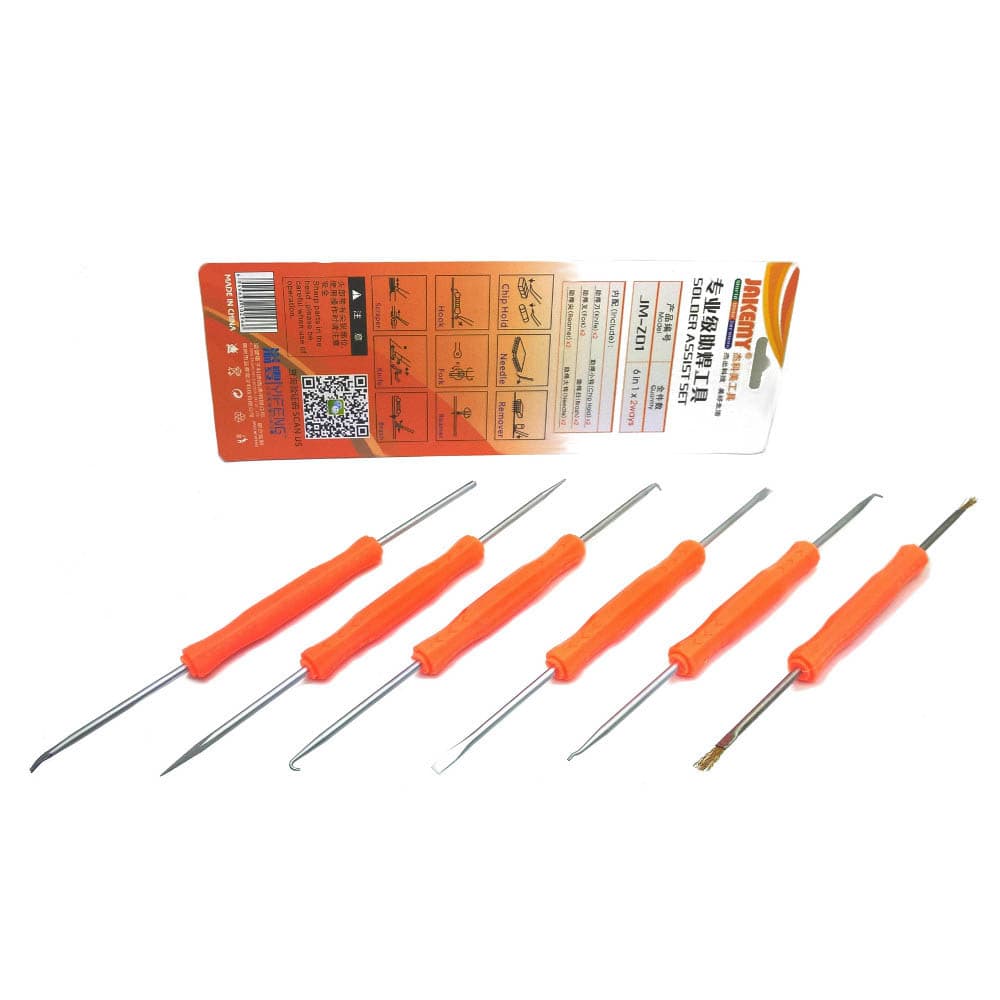 Απαραίτητο για όλους το επαγγελματίες, το βοηθητικό σετ κολλητηρίου JM-Z01 έρχεται για να σας λύσει τα χέρια! Με 6 διαφορετικά εργαλεία εις διπλούν, είναι κατάλληλο για πάρα πολλές εφαρμογές που χρειάζεται να γίνουν κατά την διαδικασία αποκόλλησης/επισκευής/συγκόλλησης υλικών πάνω σε ένα PCB.2 chip holders για σταθερό κράτημα μικροϋλικών κατά την συγκόλληση.2 hooks για την αφαίρεση υλικών through-hole.2 needles/reamers για την διαχείριση υλικών SMD και επισκευή των PCB holes.2 knives για την επισκευή νησίδων (πίστα) των PCB.2 brashes για την αφαίρεση οξυδώσεων στα PCB.2 forks για το μαντάλωμα των μικροϋλικών στα PCB.