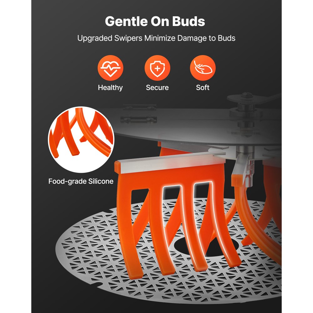 Αποτελεσματικό κλάδεμα φύλλων: Αυτό το χειροκίνητο κλαδευτήρι φύλλων 16" διαθέτει έναν ισχυρό κινητήρα μεταβλητής ταχύτητας και πολλαπλούς τύπους λεπίδων, επιτρέποντας αποτελεσματικό κλάδεμα σε διάφορους τύπους φυτών, ελαχιστοποιώντας παράλληλα τη ζημιά στα μπουμπούκια. Το διαφανές ακρυλικό καπάκι προσφέρει πλήρη ορατότητα για ακριβή αποτελέσματα κλαδέματος. Εργονομικός σχεδιασμός για άνεση: Κατασκευασμένο για πολύωρες συνεδρίες, το ψαλίδι για μπουμπούκια διαθέτει λαβή αλουμινίου 145° και αντιολισθητικά μαξιλαράκια σιλικόνης, εξασφαλίζοντας άνετο, σταθερό κράτημα και εμπειρία κουρέματος χωρίς κόπωση. Βάση με καπάκι από πάνω: Η στιβαρή βάση με καπάκι από πάνω κρατάει σταθερά στη θέση της την υδροπονική μηχανή κοπής υγρής και ξηρής κοπής. Το αρθρωτό καπάκι ανοίγει ομαλά, επιτρέποντάς σας να προσθέτετε φυτικό υλικό χωρίς να διακόπτετε τη ροή εργασίας σας - ιδανική για συνεχείς συνεδρίες κλαδέματος. Ανθεκτικό & Εύκολο στη Συντήρηση: Σχεδιασμένες για γρήγορη αποσυναρμολόγηση και καθαρισμό, οι κοφτερές λεπίδες από ανοξείδωτο ατσάλι προσφέρουν καθαρές, αποτελεσματικές κοπές με λιγότερη προσπάθεια. Οι ρυθμιζόμενες και αντικαταστάσιμες λεπίδες καλύπτουν διαφορετικές ανάγκες κλαδέματος. Τα δάχτυλα σιλικόνης τροφίμων είναι άοσμα και απαλά με τη σοδειά σας, διατηρώντας την ποιότητα του προϊόντος. Ευέλικτη χρήση: Αυτό το ψαλίδι για μπουμπούκια και φύλλα είναι ιδανικό για το κλάδεμα φύλλων και στελεχών από υδροπονικά φυτά, λουλούδια και βότανα. Επίσης, κατάλληλο για την αφαίρεση μπουμπουκιών και την προετοιμασία βοτανικών υλικών για εξαγωγή αιθέριων ελαίων ή αρωματοθεραπεία. Απλό στη χρήση και εύκολο στη συντήρηση—ιδανικό τόσο για οικιακούς καλλιεργητές όσο και για επαγγελματίες.