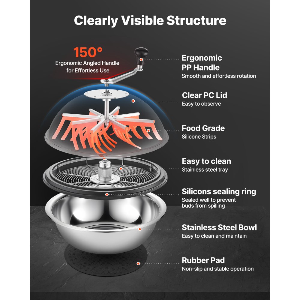 Αποτελεσματικό κλάδεμα φύλλων: Αυτό το χειροκίνητο κλαδευτήρι μπουμπουκιών 24" διαθέτει ισχυρό κινητήρα μεταβλητής ταχύτητας και πολλαπλές επιλογές λεπίδων για γρήγορο και αποτελεσματικό κλάδεμα. Κλαδεύει τα φύλλα διαφόρων φυτών και ελαχιστοποιεί τη ζημιά στα μπουμπούκια. Το διαφανές ακρυλικό καπάκι επιτρέπει την ορατότητα σε πραγματικό χρόνο για ακριβή αποτελέσματα κλαδέματος. Εργονομική άνεση: Σχεδιασμένο με λαβή αλουμινίου υπό γωνία 145° και αντιολισθητικά μαξιλαράκια σιλικόνης, αυτό το τρίμερ για φύλλα μπουμπουκιών προσφέρει σταθερή, εργονομική λαβή, εξασφαλίζοντας άνεση και έλεγχο ακόμα και κατά τη διάρκεια μεγάλων χρήσεων. Βολικό σύστημα φόρτωσης από πάνω: Το στιβαρό άνω πλαίσιο συγκρατεί με ασφάλεια το χορτοκοπτικό στη θέση του, ενώ το αρθρωτό επάνω καπάκι ανοίγει εύκολα για συνεχή τροφοδοσία, διατηρώντας την ροή εργασίας σας ομαλή και αδιάλειπτη. Ανθεκτικό & Εύκολο στη συντήρηση: Κατασκευασμένες για γρήγορη αποσυναρμολόγηση και καθαρισμό, οι κοφτερές λεπίδες από ανοξείδωτο ατσάλι εξασφαλίζουν γρήγορες, καθαρές κοπές, εξοικονομώντας χρόνο και προσπάθεια. Οι ρυθμιζόμενες και αντικαταστάσιμες λεπίδες ταιριάζουν σε διάφορες ανάγκες κλαδέματος. Τα δάχτυλα σιλικόνης ποιότητας τροφίμων είναι άοσμα, βοηθώντας στη διατήρηση της ποιότητας των μπουμπουκιών. Ευρεία εφαρμογή: Αυτή η μηχανή κοπής υδροπονίας για υγρή και ξηρή χρήση είναι ιδανική για το κλάδεμα φύλλων και στελεχών από υδροπονικά φυτά και λουλούδια. Επίσης, ιδανική για την αφαίρεση μπουμπουκιών και την άλεση υλικού για εξαγωγή αιθέριων ελαίων και χρήση στην αρωματοθεραπεία. Εύκολη λειτουργία και συντήρηση.