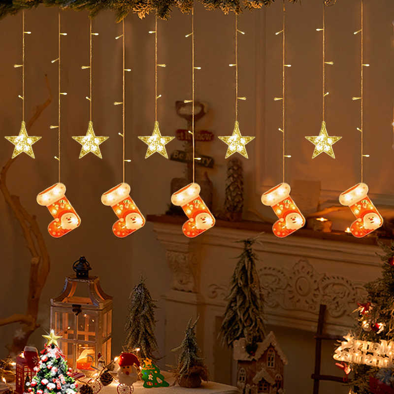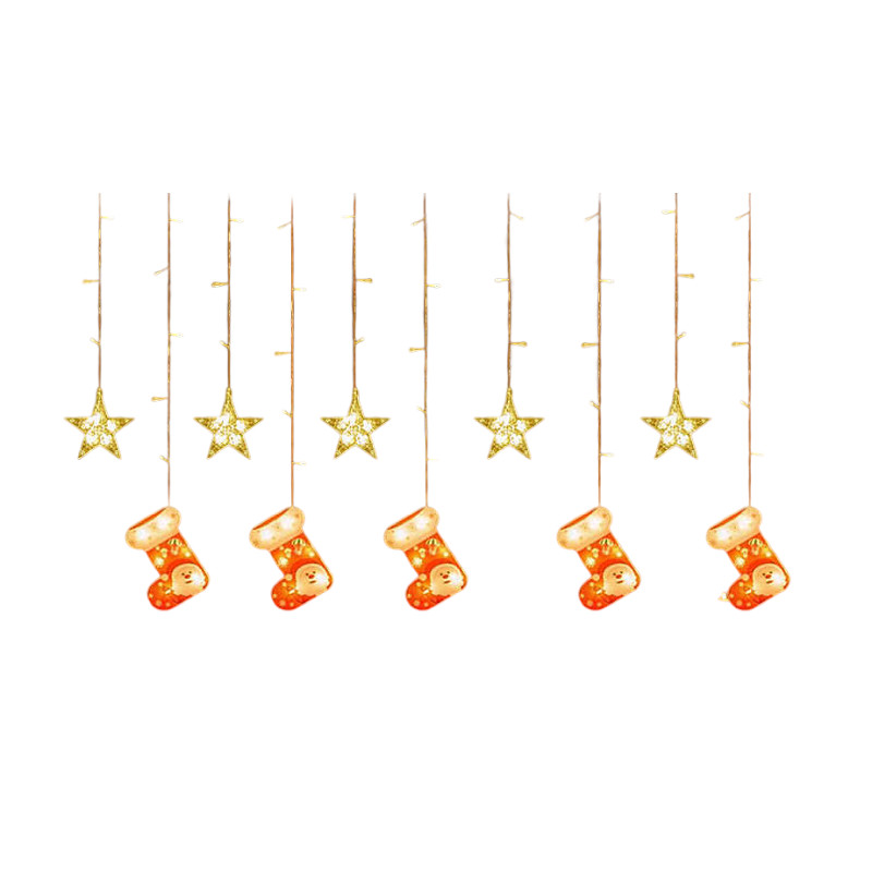 Χριστουγεννιάτικα διακοσμητικά φώτα LED τύπου κουρτίνα με σχέδιο καλτσάκι και αστέρια.