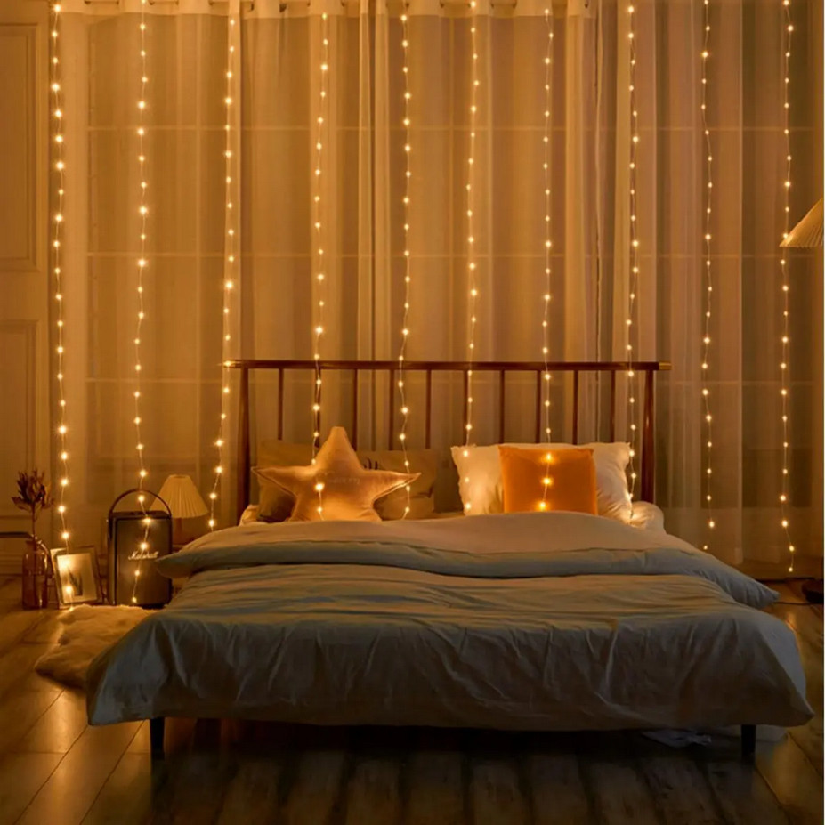 Χριστουγεννιάτικα διακοσμητικά φώτα LED τύπου Κουρτίνα, με χρώμα φωτισμού θερμό λευκό και ρυθμιζόμενα προγράμματα.