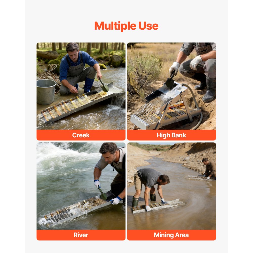 Διπλής λειτουργίας Χρυσό Φράγμα Υψηλής Πίεσης: Χειροκίνητη εναλλαγή μεταξύ λειτουργίας φράγματος και ρύθμισης υψηλής πίεσης. Η λειτουργία υψηλής πίεσης χειρίζεται αποτελεσματικά μεγαλύτερες παρτίδες, ενώ η λειτουργία φράγματος είναι κατάλληλη για ρηχά νερά και μικρά ρέματα, καλύπτοντας διαφορετικές ανάγκες μετατόπισης. Πλαίσιο αλουμινίου: Κατασκευασμένο με ελαφρύ, μακράς διαρκείας πλαίσιο αλουμινίου που αντιστέκεται στη φθορά, την πίεση και τη σκουριά, αυτό το κιβώτιο φρέαρ υψηλής απόδοσης έχει σχεδιαστεί για να αντέχει σε απαιτητικές εξωτερικές συνθήκες εξόρυξης για εκτεταμένη διάρκεια ζωής. Αποδοτική ανάκτηση: Η διπλή στρώση βρύων και χαλιών εξόρυξης στο κιτ χρυσοθήρα συλλαμβάνουν καθαρό χρυσό έως και 50 mesh, με ανάκτηση έως και 98,7%. Το γωνιακό πλέγμα και η μεγάλη αυλάκωση βελτιστοποιούν τη ροή του νερού για γρήγορο διαχωρισμό άμμου, χαλικιού και βαρέων μετάλλων. Φορητός σχεδιασμός: Η πτυσσόμενη κατασκευή μειώνει το μέγεθος της συσκευασίας κατά πάνω από 50%. Οι ιμάντες ώμου με ασφαλή λαβή και το σακίδιο πλάτης με διπλό κορδόνι κάνουν την αποθήκευση και τη μεταφορά εύκολη, καθιστώντας αυτό το κιτ πανοραμικής μεταφοράς σε χρυσό χρώμα ιδανικό για πεζοπορία και οδικά ταξίδια. Ευέλικτη χρήση: Κατάλληλο για οικογενειακά ταξίδια, εξάσκηση σε αρχάριους, εξερεύνηση από ειδικούς και κινητή εξόρυξη, αυτός ο φορητός εξοπλισμός εξόρυξης προσαρμόζεται εύκολα σε ένα ευρύ φάσμα σεναρίων εξόρυξης χρυσού.