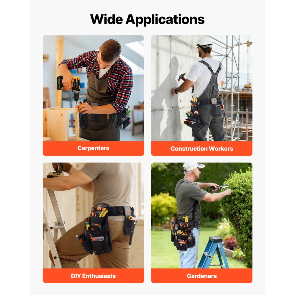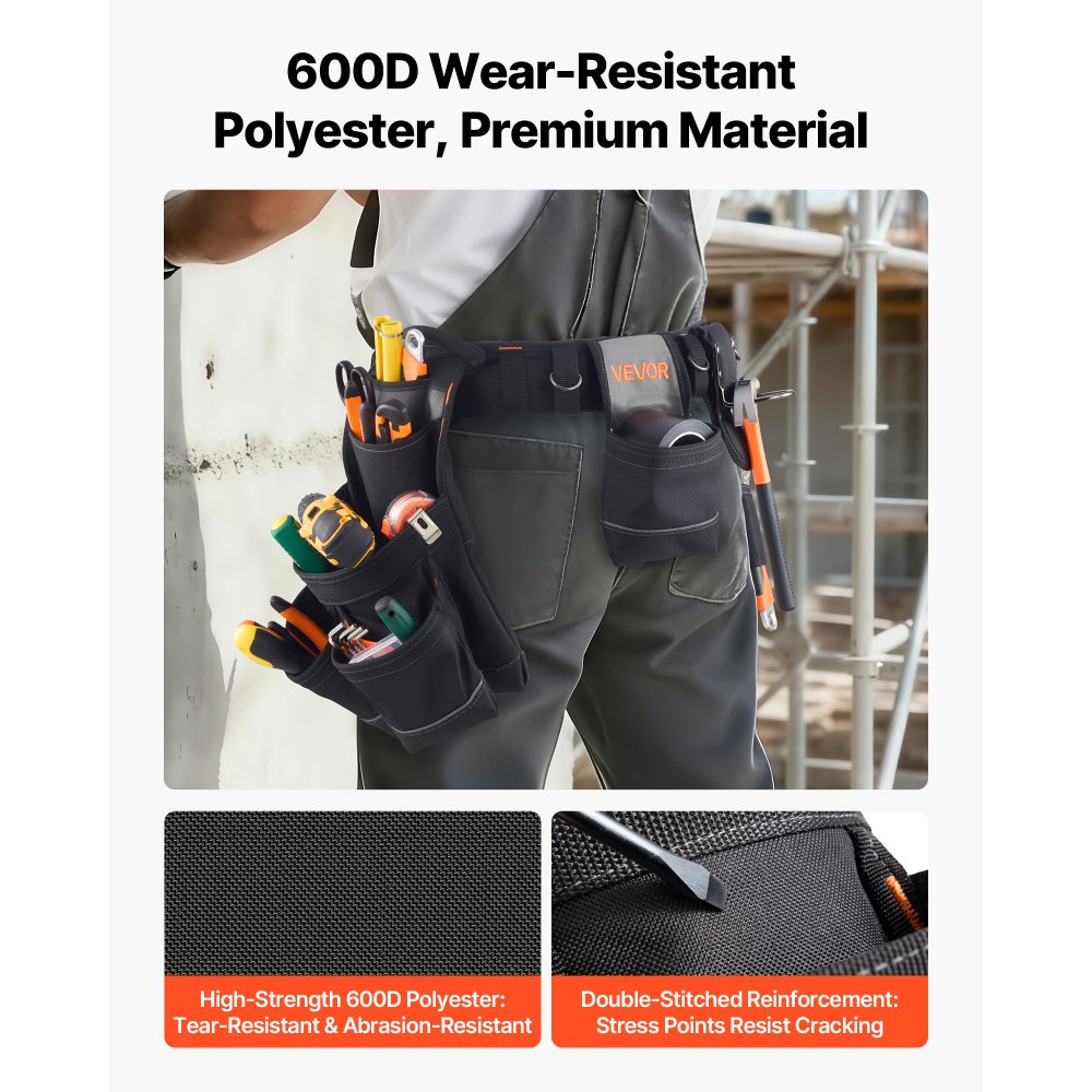 Αποθήκευση με 18 τσέπες: Η ζώνη εργαλείων μας διαθέτει 18 τσέπες για να οργανώνετε σφυριά, κατσαβίδια, πένσες, μετροταινίες και καρφιά. Βρείτε γρήγορα εργαλεία, εξοικονομώντας χρόνο και ενισχύοντας την αποδοτικότητα—ιδανικό για ξυλουργικές εργασίες, ηλεκτρολογικές εργασίες και εργοτάξια. Ρυθμιζόμενη μέση: Αυτή η ζώνη εργαλείων ξυλουργού υποστηρίζει ρύθμιση μέσης 31–51 ίντσες με ανθεκτική αγκράφα και συρόμενο ρυθμιστή για άνετη εφαρμογή. Προσαρμόζεται εύκολα σε μπουφάν ή ρούχα εργασίας, διατηρώντας τη ζώνη σταθερή κατά το σκύψιμο, την αναρρίχηση ή την κίνηση. Εργονομική και άνετη μέση: Η φαρδιά, επενδεδυμένη ζώνη εργαλείων κατανέμει ομοιόμορφα το βάρος και μειώνει την καταπόνηση. Παραμένει ασφαλής και άνετη κατά τη διάρκεια μεγάλης, έντονης εργασίας, αποφεύγοντας τη συστολή και την κόπωση, βοηθώντας τους εργαζομένους να συγκεντρωθούν και ενισχύοντας την αποδοτικότητα. Ανθεκτικό στην τριβή και το σχίσιμο: Με ενισχυμένο πολυεστέρα 600D με διπλές ραφές και δεμένες άκρες, η ζώνη εργαλείων Framers μας αντιστέκεται στη φθορά, το σχίσιμο, το κρέμασμα και το τσαλάκωμα ακόμα και κάτω από βαριά εργαλεία, με πλήρες φορτίο ή σε κατασκευές. Κατασκευασμένο για επαγγελματίες και ερασιτέχνες. Ευέλικτη χρήση: Ιδανική για ξυλουργούς, ηλεκτρολόγους, εργάτες οικοδομών και ερασιτέχνες, αυτή η ζώνη εργαλείων κατασκευών διατηρεί τα εργαλεία σας οργανωμένα και χωρίς χέρια. Κατάλληλη για βαριές εργασίες ή επισκευές στο σπίτι, προσφέρει αποτελεσματική, ολοκληρωμένη λειτουργικότητα.